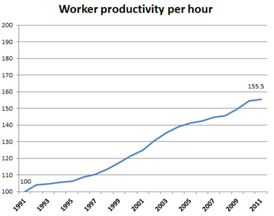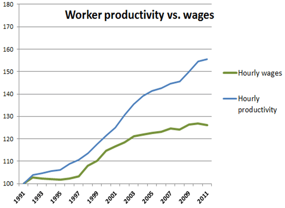 Hourly wages have grown by 27% over that same period – less than half as much as productivity growth.
